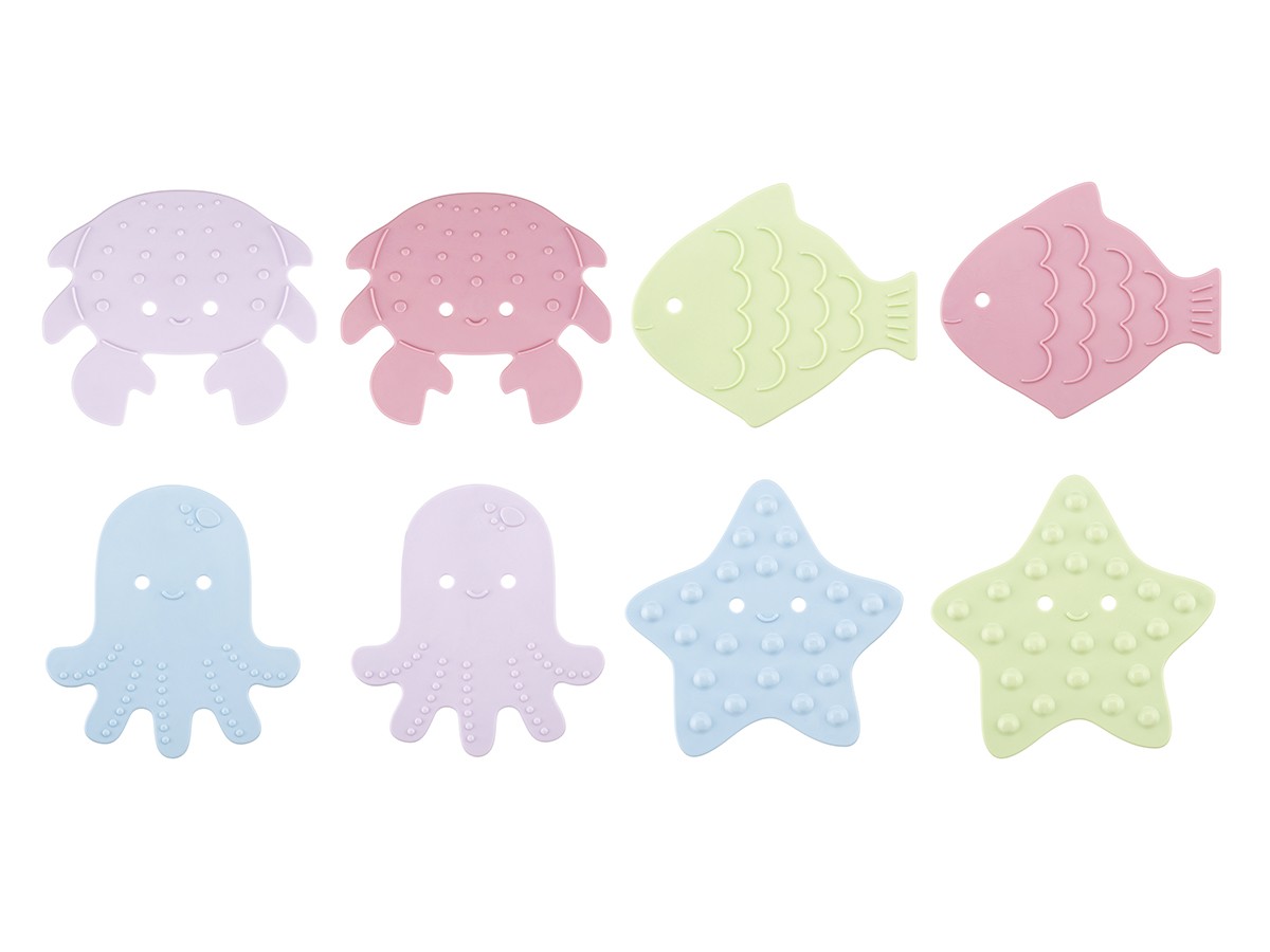 Мини коврики для ванной произведены из современного и безопасного материала ТЭП. Этим коврикам можно найти множество применений. Мини-коврики станут отличной заменой большому коврику, который неудобно промывать и сушить. Также их используют как массажеры, потому что рельефная поверхность обеспечивает бережный массаж стоп и ладоней. Малыш может грызть их, потому что они изготовлены из специального безопасного материала. Ими можно также украсить интерьер, налепив коврики на дно и стенки ванны или кафель, чтобы не только обеспечить удобство, но и расставить яркие цветовые акценты. Кроме того, эти мини-коврики абсолютно не пахнут, потому что не содержат ПВХ. Для ухода их достаточно просто периодически промывать с мылом, полоскать и хорошо сушить. Они легко и надежно крепятся с помощью присосок на любую гладкую поверхность, при этом не оставляют следов.