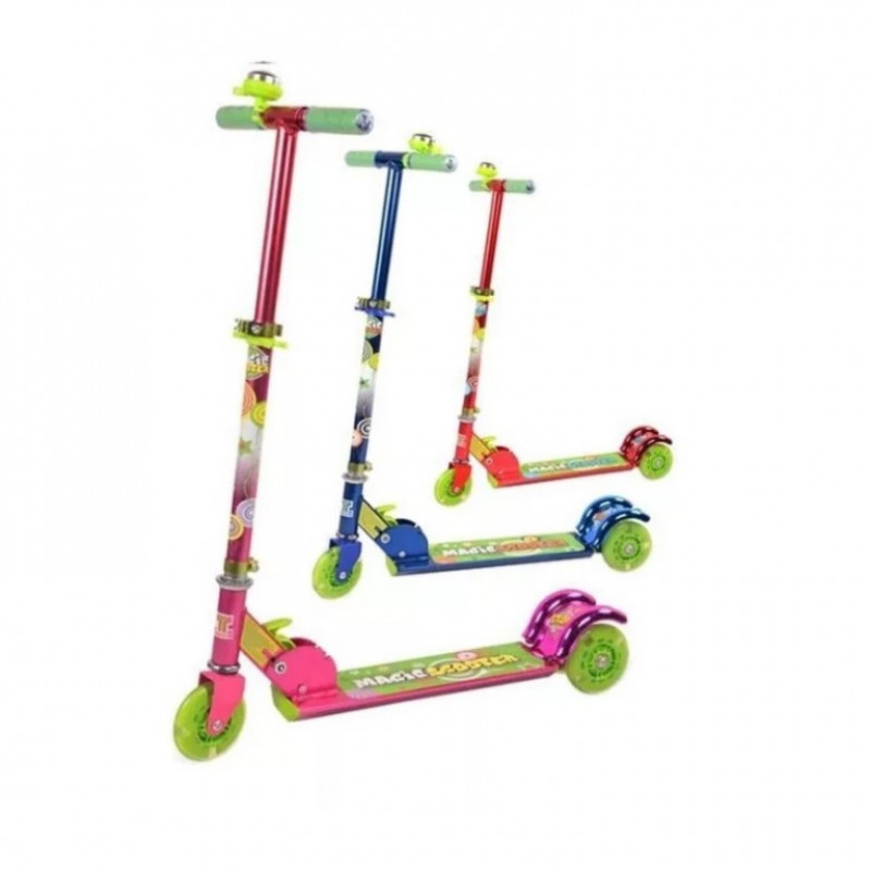 Самокат Magic Scooter со светящимися колёсами предназначен для комфортного катания детей от 3 до 12 лет. Самокат оснащён поворотным механизмом руля и мягкими колесами. Специальное покрытие деки защищает от соскальзывания ног во время движения. Руль регулируется по высоте. Ручки руля пластиковые с ограничителями на концах.