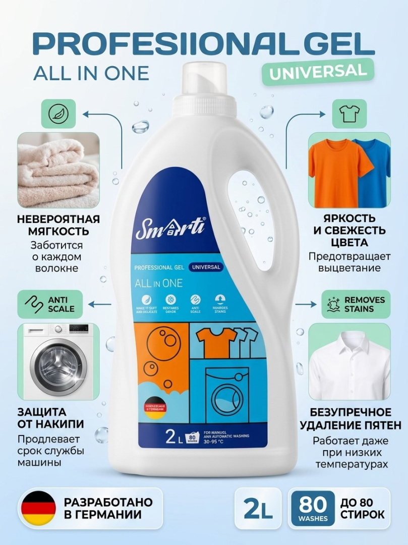 Гель для стирки Smarti ALL in ONE — экономичное и эффективное средство для ежедневной чистоты вашего белья. Выбирайте надежную формулу для свежести и бережного ухода за вещами.