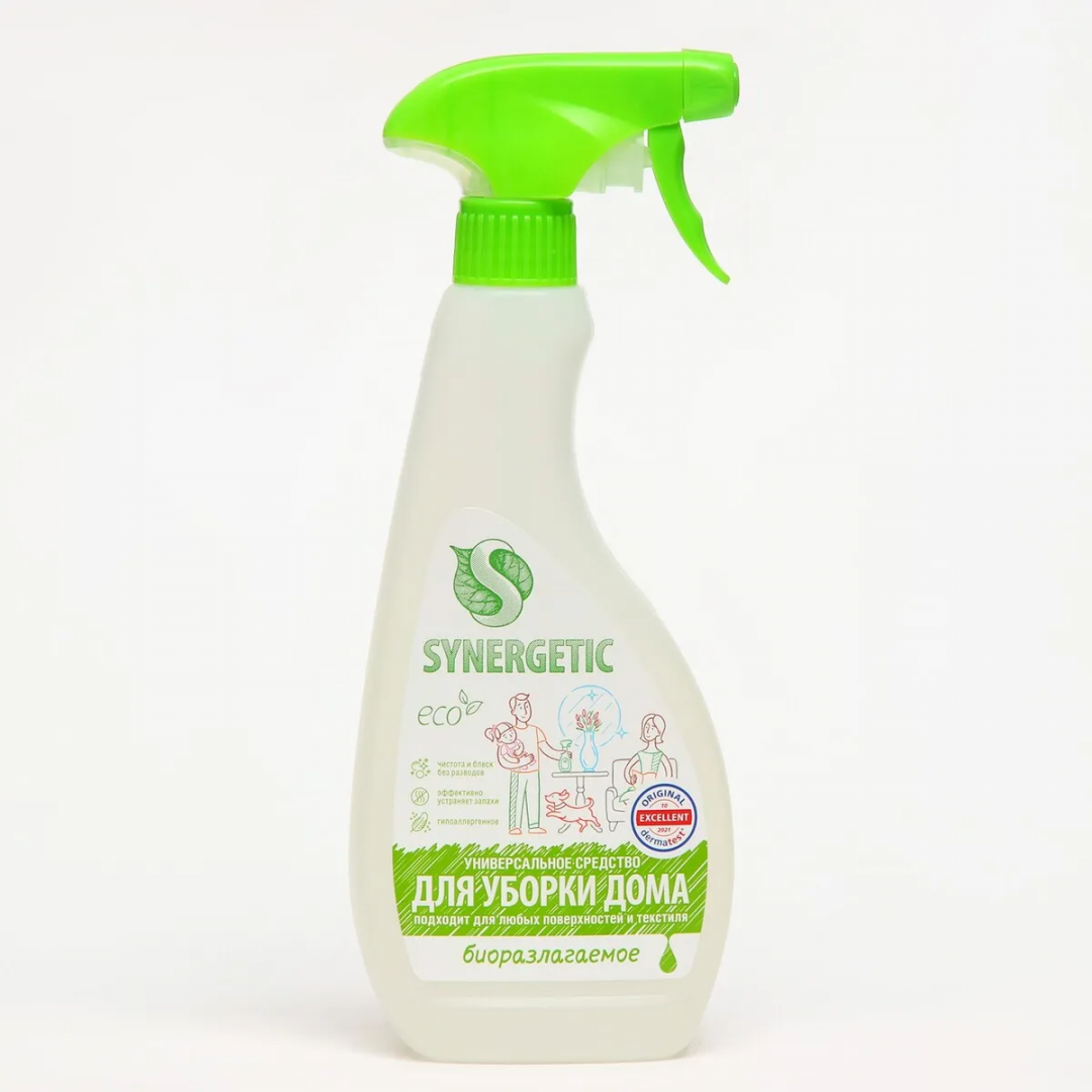 Универсальное чистящее средство для уборки дома, любых поверхностей и текстиля 0,5 л. Универсальный биоразлагаемый спрей для уборки SYNERGETIC - это многофункциональное чистящее средство, которое быстро и легко удаляет любые виды загрязнений: грязь, масложировые пятна, пыль, налет. Эффективно устраняет неприятные запахи и обезжиривает поверхность, защищая ее от повторного загрязнения. Спрей подходит для любых видов поверхностей: напольных (ламината, линолеума, паркета), глянцевых и лакированных, эмалированных и деревянных, пластика, керамики, хрома, нержавеющей стали, текстиля (ковров, обивки мягкой мебели и других), кафельной плитки. Легко смывается, не оставляя разводов, и придает блеск. Средство является гипоаллергенным и не содержит красителей, искусственных ароматизаторов, хлора и агрессивных ПАВ, а также полностью состоит из биоразлагаемых компонентов.