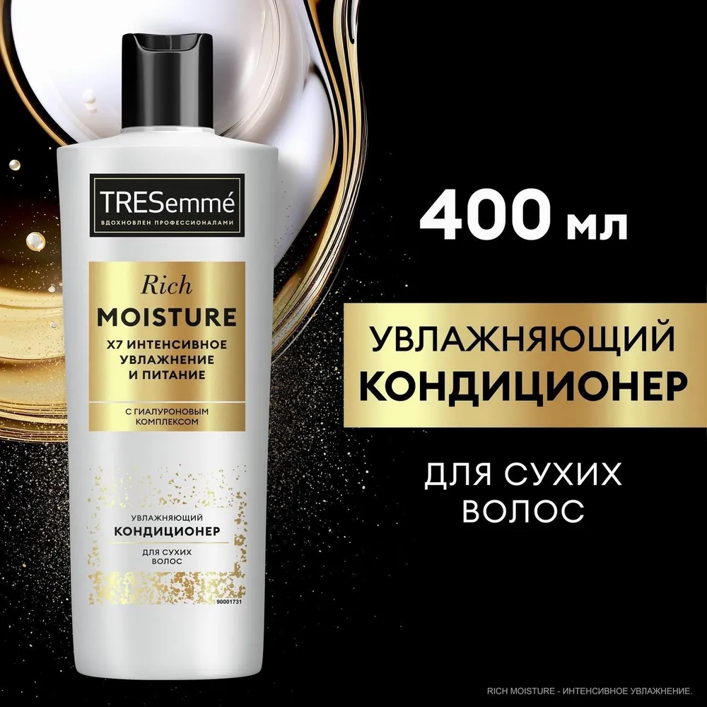 Кондиционер для волос TRESemmé Rich Moisture — новинка для глубокого увлажнения’ волос, вдохновленная профессиональными средствами. Формула кондиционера обогащена гиалуроновым комплексом’’ и оказывает видимый результат! Верните жизненную силу сухим, обезвоженным волосам вместе с TRESemmé: 1. Кондиционер для волос женский глубоко питает’ и увлажняет пряди. 2. Благодаря кремовой текстуре средство легко распределяется, обволакивает каждый волос и легко смывается. 3. Кондиционер облегчает расчесывание и дарит волосам сияющий блеск. Средство оптимально подходит для поврежденных волос, которые стали истонченными и ломкими из-за горячих укладок и окрашивания. Также его можно использовать для дополнительного ухода за нормальными волосами. ‘в пределах кутикулы волоса. ‘’гиалуроновая кислота, витамины Е, В5, В3.