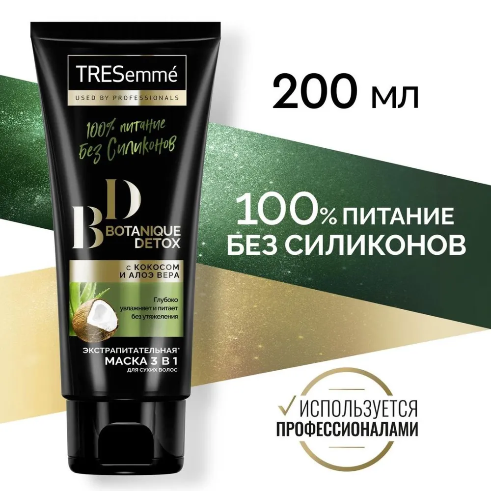 Твои волосы нуждаются в питании и увлажнении? Хочешь иметь гладкие и мягкие волосы? Теперь это возможно с новой экстрапитательной* маской TRESemm из серииBotanique Detox, вдохновленной природой! Без силиконов, парабенов и красителей. Формула с кокосом и алоэ вера увлажняет волосы и наполняет питательными компонентами.• 'Обеспечивает глубокое' увлажнение и питание;• Оставляет ощущение мягкости и разглаживает волосы;• Легкая текстура не утяжеляет волосы, сохраняя их свежесть и подвижность.Попробуй все три способа применения маски. Как кондиционер: нанеси на вымытые влажные волосы, смой. В качестве маски: нанеси на вымытые влажные волосы, оставь на 3-5 минут, смой. И как несмываемый уход: нанеси на кончики вымытых влажных волос тонким слоем, не смывай. Подходит для регулярного использования.Всего три шага на пути к безупречному образу и роскошным волосам. Начни с шампуня для качественного и бережного очищения. Далее для интенсивного ухода используй кондиционер и маску 3 в 1 совместно.Профессионалы уверены: каждая укладка зависит от качества волос. TRESemme – профессиональная основа для любого образа. Бренд следует современной концепции в уходе за собой Do it yourself (сделай сама): ты больше не зависишь от стилистов и визажистов! Ведь каждая девушка знает, что подойдет именно ей. Если у тебя под рукой есть качественные средства по уходу и советы от TRESemme, ты самостоятельно сможешь создать идеальный образ. Еще больше информации на официальном сайте бренда.Пользуйся средствами для волос TRESemm и восхищай красивыми и ухоженными волосами.Результат: мягкие и блестящие волосы без утяжеления!