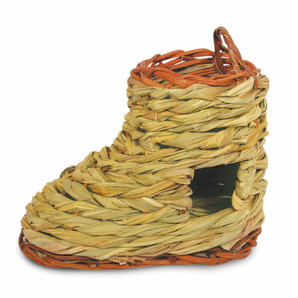 Домик для мелких животных в форме ботинка выполнен из сухих стеблей и листьев луговых трав.