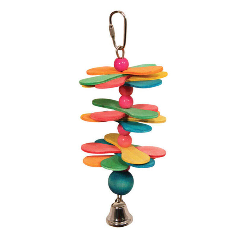 Игрушка для птиц в виде подвески с разноцветными лепестками ромашки и колокольчиком.