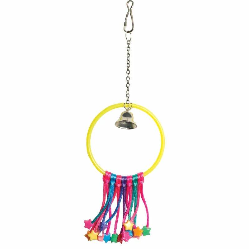 Игрушка для птиц в виде обруча с колокольчиком и подвесками из нитей с бусинками на них.
