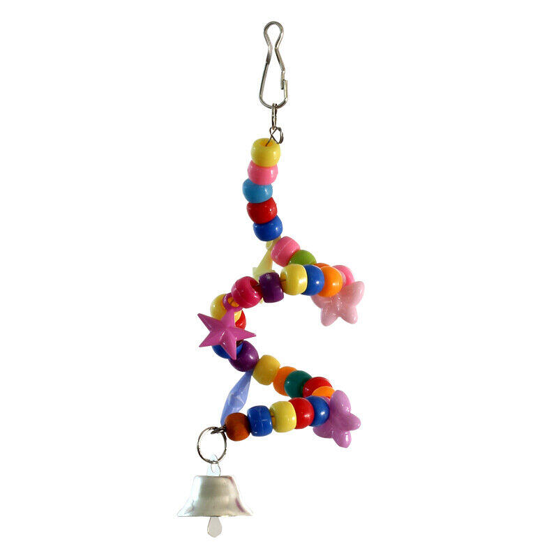Игрушка для птиц в виде змейки из бусинок с колокольчиком.