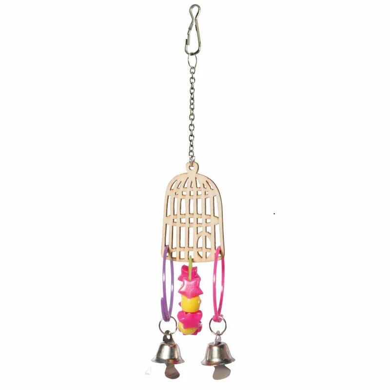 Игрушка для птиц в виде клетки с подвесками из бус и пластиковых колец с колокольчиками.