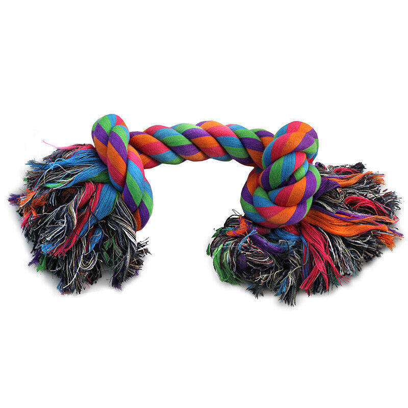 Веревка цветная с двумя узлами. Такие игрушки отлично массируют десны и очищают зубной налет во время игры. Веревки сплетены из нитей натурального хлопка, поэтому безопасны для здоровья питомца.