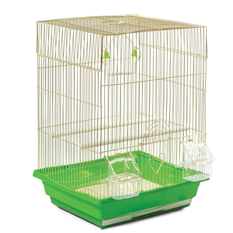 Клетка для птиц с ровной крышей. В комплектацию изделия входят 2 пластиковые кормушки, качели и 2 деревянные жердочки.