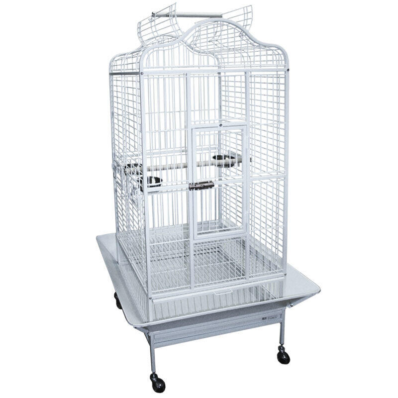 Стальная клетка на колесах, предназначенная для птиц и попугаев крупных размеров. Ее эмалированные прутья не гнутся, имеют устойчивую окраску и не гремят. Клетка имеет большую удобную дверцу, надежно запирающуюся на плотный замок, а за счет дополнительной внешней конструкции выгуливать птиц можно прямо на крыше. Клетка также оборудована специальным выдвижным поддоном, облегчающим процесс уборки.