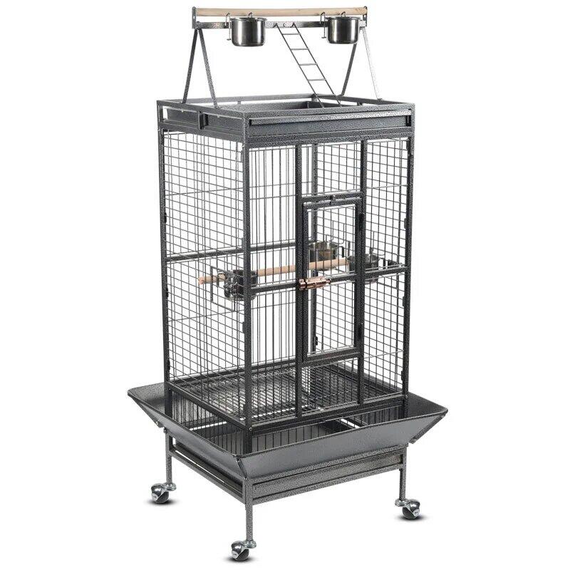 Стальная клетка на колесах, предназначенная для птиц и попугаев крупных размеров. Ее эмалированные прутья не гнутся, не облупляются и не гремят. Клетка имеет большую удобную дверцу, надежно запирающуюся на плотный замок, а за счет дополнительной внешней конструкции выгуливать птиц можно прямо на крыше изделия. Клетка также оборудована специальным выдвижным поддоном, облегчающим процесс уборки.