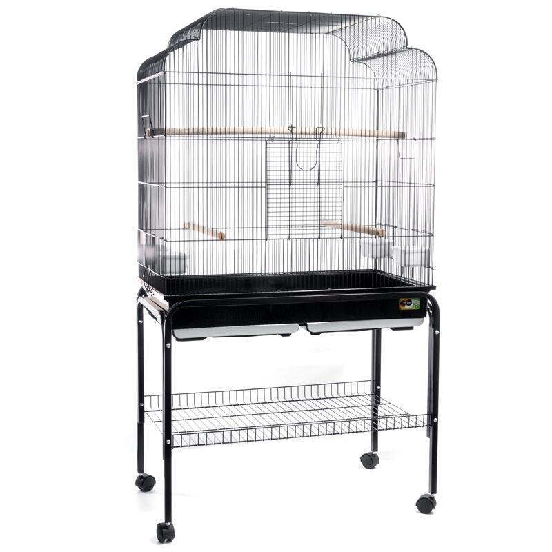 Стальная клетка на колесах с фигурной крышей предназначена для птиц средних и крупных размеров. Эмалированные прутья не гнутся, не облупляются и не гремят. Клетка оборудована большой удобной дверцей, полочкой для хранения кормов и аксессуаров и двумя выдвижными пластиковыми поддонами, облегчающими процесс уборки. В комплектацию изделия входят 4 внутренние кормушки и 3 деревянные жердочки.