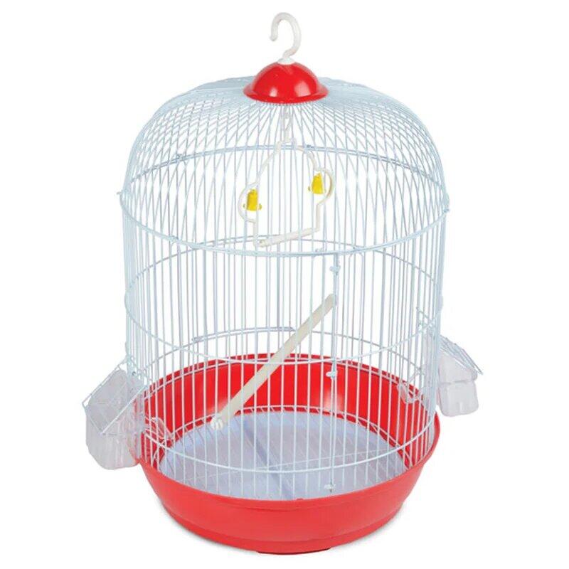 Круглая эмалированная клетка для птиц. В комплектацию изделия входят 2 кормушки, жердочка и качели. Клетка оборудована удобным ключком для переноски или подвешивания, а также специальным пластиковым наружным поддоном, облегчающим процесс уборки.