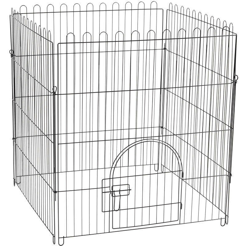 Клетка для животных эмалированная. Размер между прутьями 34,9мм. В комплекте 4 панели, одна из них с металлической дверцей, с надежным защищенным запором-задвижкой, которая открывается на 180 градусов, плотно прижимаясь к стенке. Секции соединяются между собой при помощи штыря-спицы, которая входит в специальные ушки на краях секций (вдоль боковой стороны). Высота дверцы вольера 40 см от нижней планки, 45 см от пола. Подходит для кошек, собак, кроликов и других животных.
