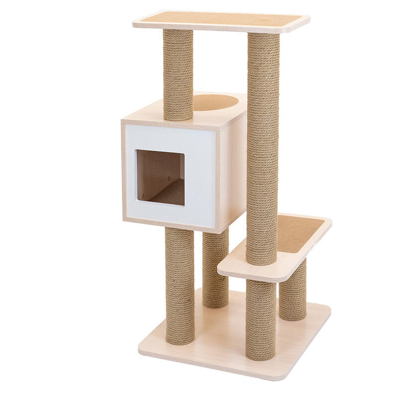 Многоярусный игровой комплекс для кошек с 2 платформами, уютным домиком и 4 столбиками-когтеточками - идеальное решение для обеспечения досуга вашего питомца.