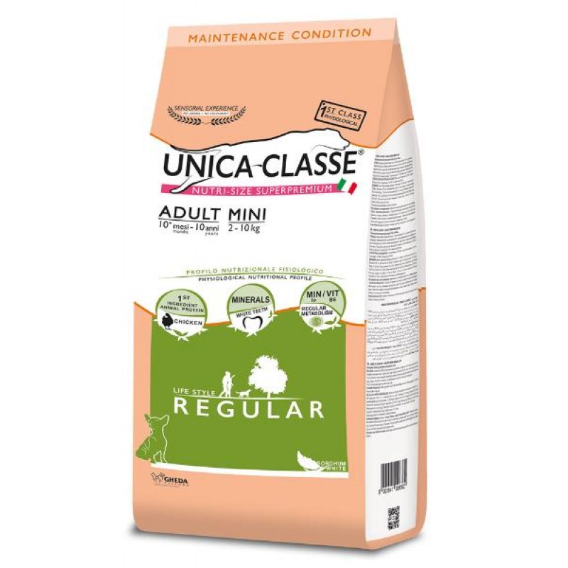 Корм Unica Classe Adult Mini Regular — полноценный ежедневный рацион для взрослых собак малых пород с массой тела от 2 до 10 кг. Подходит для собак от 10 месяцев до 10 лет.