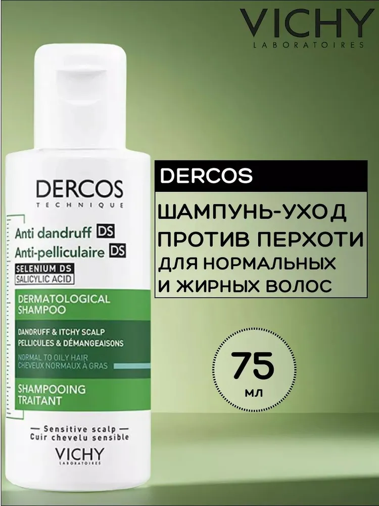 Интенсивный шампунь-уход против перхоти Vichy Dercos Anti-Dandruff для нормальных и жирных волос. Как работает: Шампунь-уход Vichy Dercos Anti-Dandruff для нормальных и жирных волос рекомендован при жирной перхоти. Технология с селеном DS восстанавливает микробиомный баланс кожи головы: бактериальный баланс. предотвращение зуда. восстановление барьерных функций. Устраняет видимую перхоть уже после первого применения и успокаивает кожу головы. Предотвращает повторное появление перхоти в течение 6 недель. Протестировано под контролем дерматологов. Результаты доказаны клинически. Эффективно даже для раздраженной кожи головы. Протестировано на потребителях. страдающих от стресса и усталости. проживающих в условиях большого города. Как использовать: Нанесите на влажные волосы. помассируйте. оставьте на 2 минуты и смойте водой. Курс применения для устранения перхоти: 2-3 раза в неделю в течение 4 недель. Для профилактики появления перхоти используйте 1 раз в неделю. Избегайте попадания средства в глаза и на поврежденную кожу. При попадании в глаза немедленно промыть водой. Активные компоненты: Керамид. салициловая кислота. Состав: Aqua /Water. Sodium Laureth Sulfate. Glycol Distearate. Coco-betaine. Glycerin. Dimethicone. Carbomer. Ci 19140/Yellow 5 . C Itr Ic Acid. Menthol. 2-oleamido-1.3-octadecanediol. Ppg-5-ceteth-20. Salicylic Acid. Selenium Sulfide. Sodium Benzoate. Sodium Chloride. Sodium Hydroxide. Tocopherylacetate. Parfum/Fragrance.
