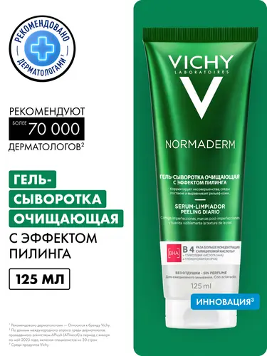 Инновационная гель-сыворотка Vichy Normaderm сочетает в себе свойства геля для умывания и концентрированной сыворотки. Она эффективна для ежедневного ухода за проблемной кожей, борется с высыпаниями, черными точками и следами постакне, начиная с этапа очищения.